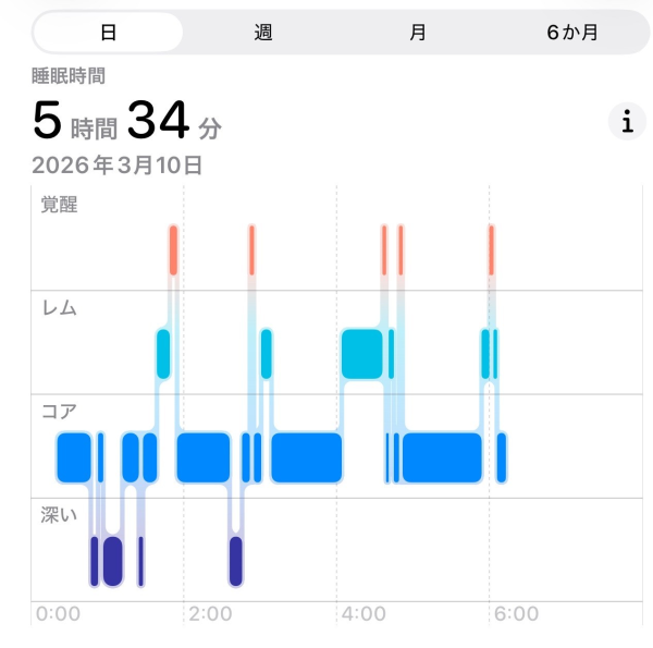 自分では6時間寝たつもりが、実際は途中で起きている時間が発生するので、5時間34分しか睡眠をとれていません。
